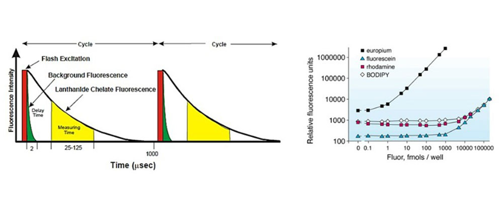 In the TRF method (Time Resolved Fluorescence), the light source does not emit continuous light radiation, but emits flashes of light (red rectangle). Since chromogen (europium chelates) has a certain inertia, it continues to emit fluorescence for a short period even after the flash of light (black line in the figure), as well as any background fluorescence (green area in the figure). The system detects only the residual fluorescence between one flash of light and the next (yellow area in the figure), where there is neither direct light from the source or that generated by the background radiation.