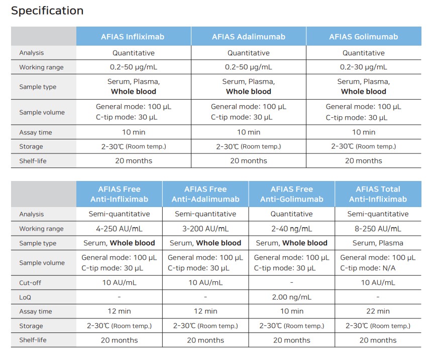 A comprehensive menu including Adalimumab, Free anti- Adalimumab, Infliximab, Free anti- Infliximab, Total anti-Infliximab, Golimumab and Free anti-Golimumab. Menu will extend with additional parameters in the near future.