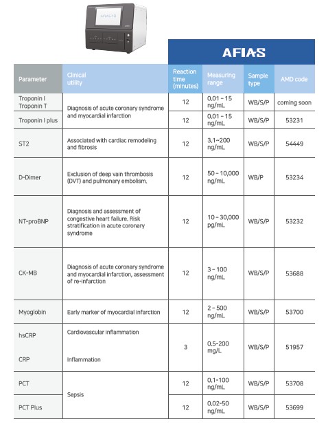 The AFIAS-10 has a comprehensive panel of cardiac markers including Tn-T, Tn-I, BNP, NT-proBNP, hsCRP, STI, Myoglobin, D-Dimer, CK-MB and Cardiac Triple (Tn-I, CK-MB, Myoglobin).