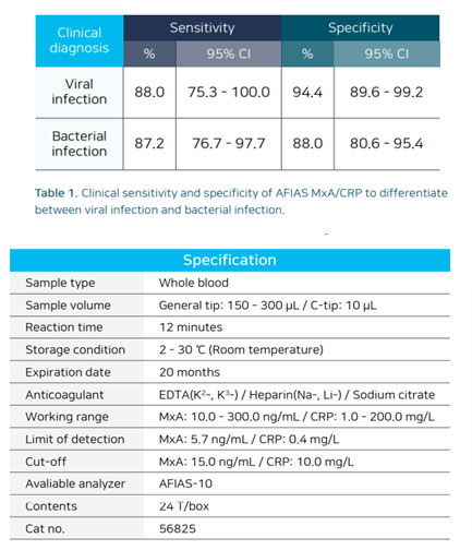 MxA(Myxovirus resistance protein A) is an intracellular blood protein that mediates cellular resistance against a wide range of viruses and is elevated in the presence of most acute active viral infections. The level of CRP (C-reactive protein) increase in the wide status of inflammation and even more in bacterial infections. The MxA/CRP combo test assists in the diagnosis of viral & bacterial infections by measuring the virus-specific markers and CRP simultaneously.