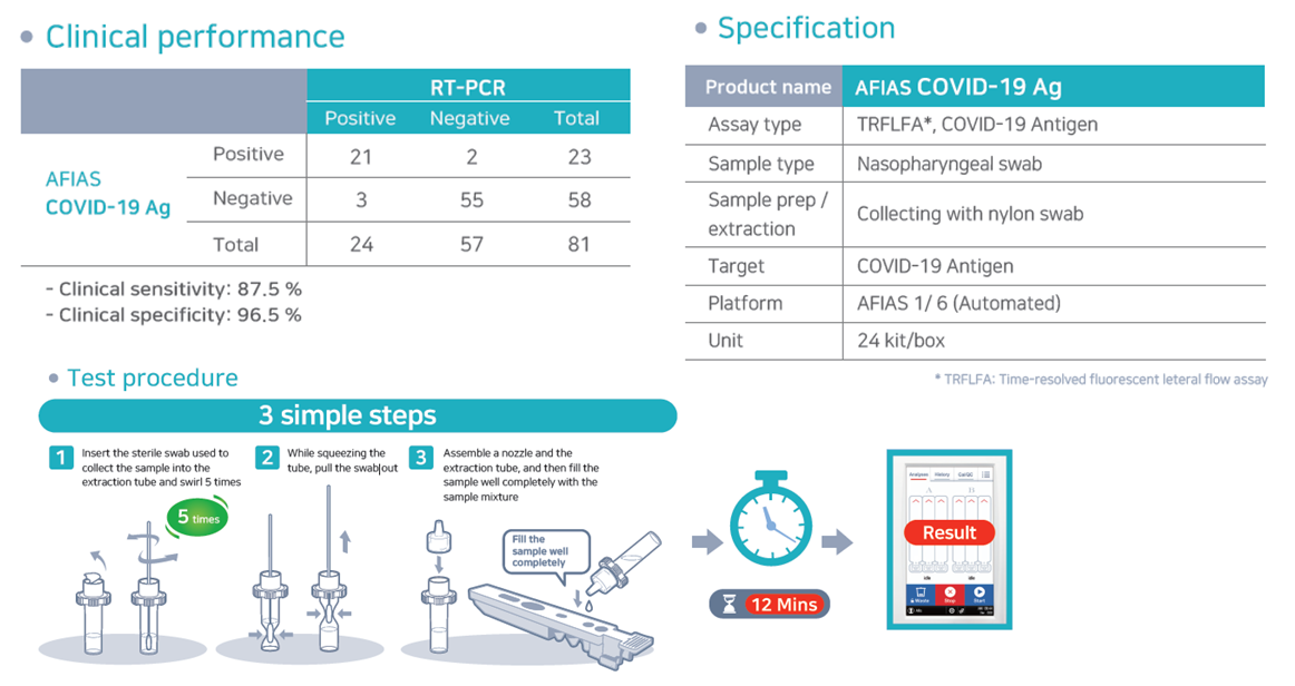 AFIAS COVID-19 Ag is an automatic fluorescence Immunoassay (FIA) for the qualitative/semi-quantitative detection of novel corona virus (eg, SARS-CoV-2, 2019-nCoV) in human nasopharyngeal swab. It is useful as an aid in management and monitoring of SARS-CoV-2 infection (COVID-19).