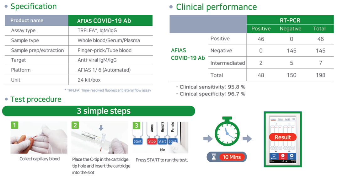 AFIAS COVID-19 Ab is an automatic fluorescence Immunoassay(FIA) for the qualitative/semi-quantitative determination of IgG/IgM antibodies against 'Novel Coronavirus' in human whole blood/serum/plasma. It is helpful as an aid in the screening of early mild, asymptomatic or acute patients for identification of 'Novel Coronavirus (eg, SARS, 2019-nCoV)' infection with high sensitivity. Finger blood (peripheral blood; whole blood) using the unique 'all-in-one' tube, allows the patient's pain to blood collection to be relatively low and suitable for large-scale screening in the field.